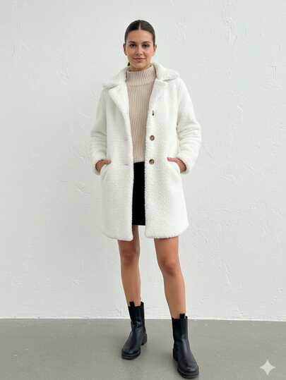 Kadın Kışlık Cepli Astarlı 3 Düğmeli Peluş Kaban - 白色 - 查看 1