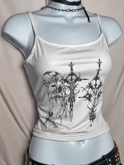 Y2k 风格甜美性感背心女无袖休闲卡通印花背心原宿百搭短款垃圾摇滚风女孩适合日常穿着 - 白色 - 查看 1