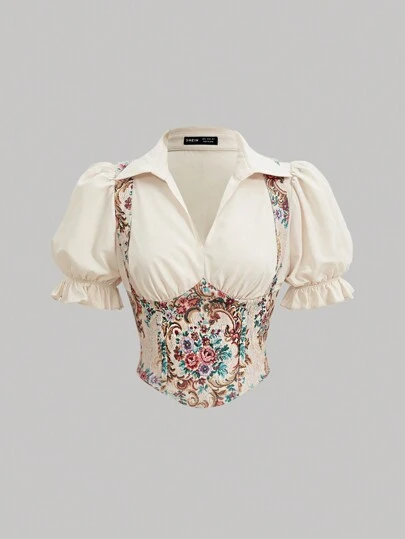 SHEIN MOD 法庭風格印花拼接 2合1泡泡袖襯衫 - 彩色 - 查看 1