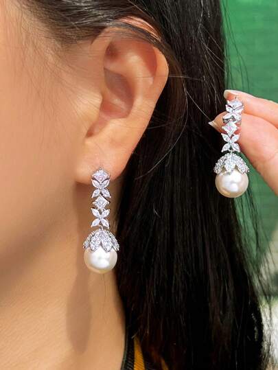 1對優雅華麗的白色鋯石鑲嵌葉形長珍珠垂墜耳環,適用於女士節日婚禮選美珠寶 - 白色 - 查看 1