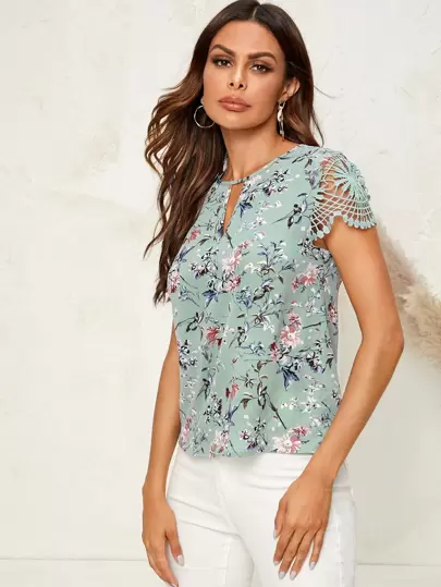 SHEIN Clasi 鎖孔領蕾絲袖植物圖案上衣 - 綠色 - 查看 1