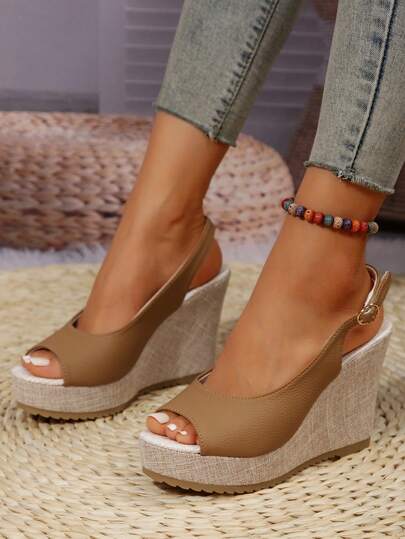 卡其色编织底绳厚底坡跟露趾凉鞋,百搭 - 卡其色 - 查看 1