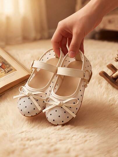 儿童鞋 可调节魔术贴搭扣 女童奶油白平底玛丽珍鞋,波点网纱蝴蝶结,适合3~12岁女孩,完美适用于派对、婚礼、复古柔软公主风