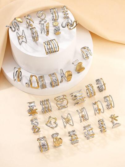 24件不锈钢时尚复古金色油压戒指混合款式,戒指款式随机,手指尺寸均为均码,适合女性日常装扮或送礼 - 漸金色 - 查看 1