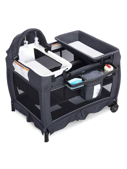 Kinder King 4 In 1 Foldable Pack And Play With Bassinet & Changing Table, Portable Playard For Babies And Toddlers, Convertible Newborn Crib Baby Bed With Canopy, Storage Bag, Dark Gray
