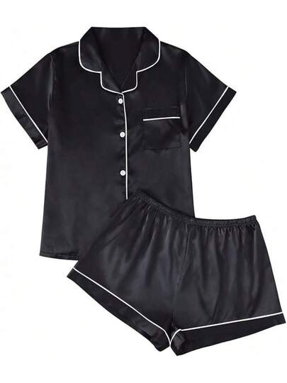 LILLUSORY Silk Satin Pajama Set Women 2 Piece Lounge Pjs Shorts Matching Summer Sleepwear Button Down Shirt Shorts Halloween - 黑色 - 查看 1