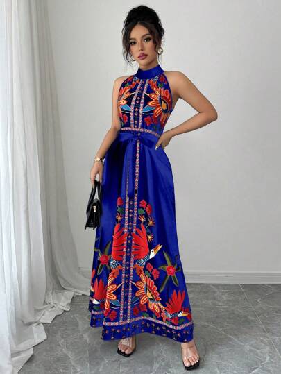 Elenzga 女士花卉印花腰部系带优雅挂脖度假连衣裙 - 藍色 - 查看 1