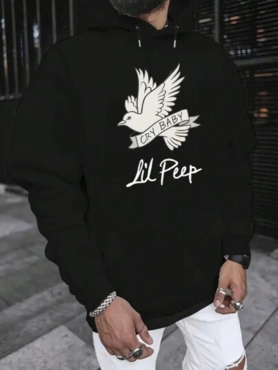 Men's Lil  Graphic Hoodie - Oversized Gray Velvet Sweatshirt With And Bird Design, Casual Long Sleeve Hooded Pullover For Autumn And Winter, Casual Wear Hoodie | Oversized Hoodie | Polyester Fabric, Sweater Hoodie - 黑色 - 查看 1