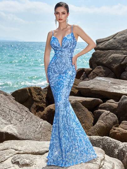 ADYCE 亮片刺绣细肩带露背鱼尾晚会礼服、婚礼宾客礼服、正式礼服、长袍 - 淺藍色 - 查看 1
