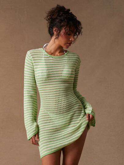 NYA SZN 针织钩针铃铛长袖夏季连衣裙圣帕特里克节新娘宾客婚礼舞会特殊场合复活节连衣裙淡绿色条纹音乐节女装 - 彩色 - 查看 1