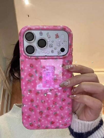 韩版ins风粉色底星草莓图案手机壳,兼容苹果16/17 Pro Max/15 Pro,女士全包防摔保护壳,兼容 14/13 - 粉色 - 查看 1