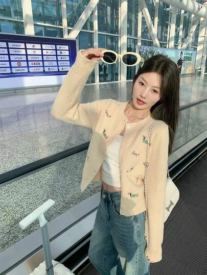 韩版休闲甜美刺绣圆领修身针织开衫 - 黃色 - 查看 1