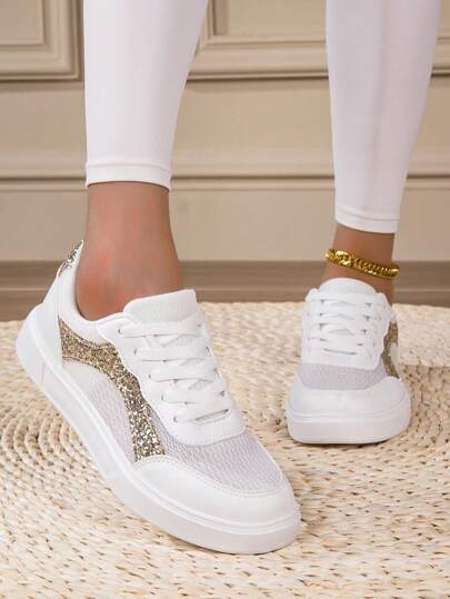 韩版女式网眼透气平底运动鞋,轻便舒适休闲鞋,百搭,鞋底柔软,防滑,适合户外活动、运动、旅行、散步、跑步,白色运动鞋 - 白金 - 查看 1