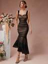 L'Amorae 高挂脖大理石印花缎面鱼尾下摆低垂后背连衣长裙