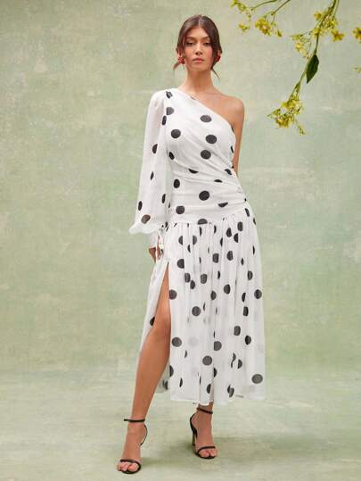 L'Amorae 优雅波尔卡圆点单肩长袖垂腰飘逸新年节日派对长裙 - 白色 - 查看 1