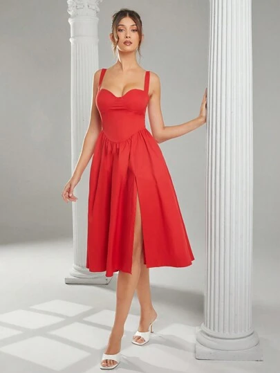 L'Amorae 秋季女装,红色优雅纯色高开叉及踝长紧身中长连衣裙,心形领口,舞会礼服,返校节礼服,婚纱,派对女士礼服。适合日常穿着、外出、音乐会、节日、派对、夜间外出、休闲穿着 - 紅色 - 查看 1