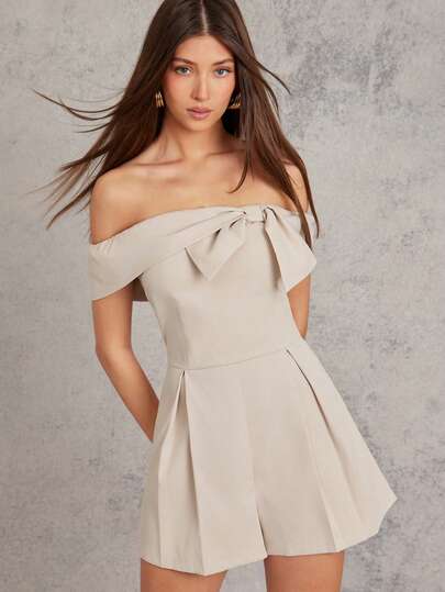 L'Amorae 女士纯色简约露肩蝴蝶结连体衣,日常穿着 - 杏色 - 查看 1
