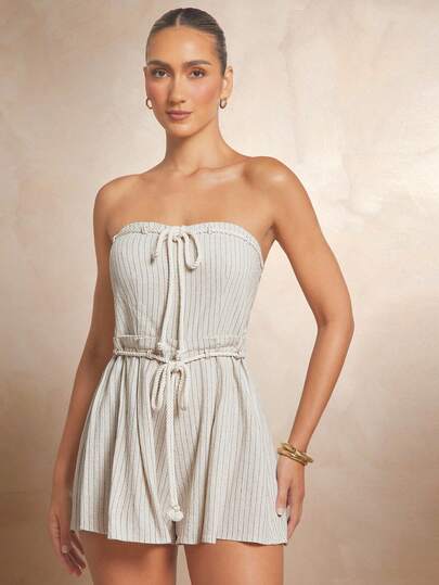 L'Amorae 女士条纹露肩亚麻连身裤,带绳饰 - 杏色 - 查看 1