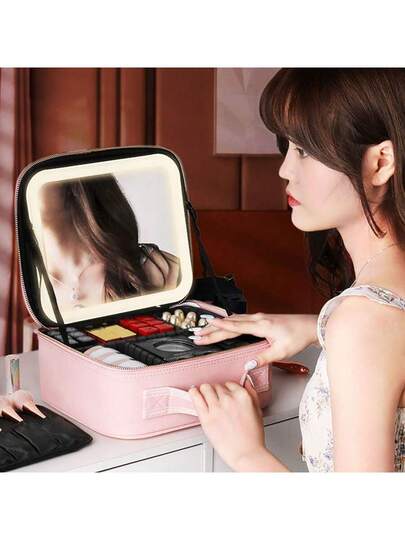 LED 燈專業化妝盒附燈全螢幕鏡子開關,便攜式旅行化妝品收納盒,美容師化妝刷美甲工具箱,粉紅色 - 粉色 - 查看 1
