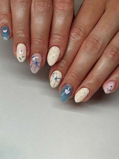 情人节美甲:30 件/套简约杏仁形心形、蝴蝶结、花卉图案粘性全覆盖按压假指甲,含 1 件果冻凝胶和 1 件指甲锉,适合女士和女孩、约会、派对、下午茶、户外美甲用品指甲 - 彩色 - 查看 5