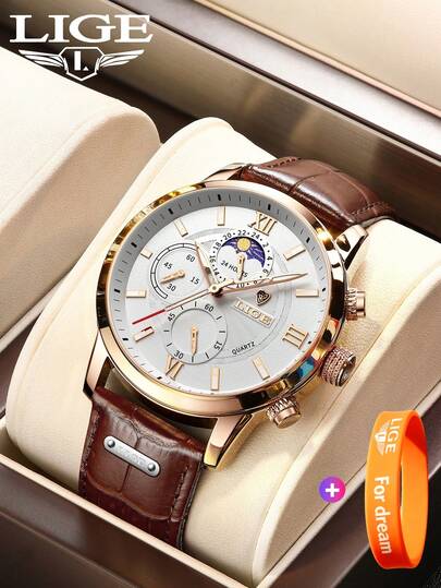 LIGE 时尚男士石英表,日月相表盘设计,防水,适合日常佩戴,夜光经典三表盘设计,时钟式时针,男士腕表 - 銀色 - 查看 10