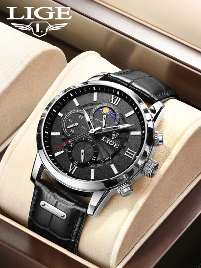 LIGE 男士三重錶盤防水石英錶,禮物送給父親 - 黑色 - 查看 1