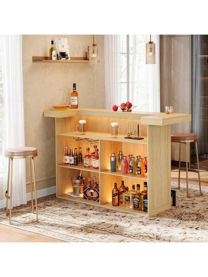 LITTLE TREE 4-Tier Bar Table, 70.9-Inch Large Wooden Home Bar Unit With Wine Glass Holder And Black Footrest, Pub Table With Storage Shelves For Home, Patio, Basement
