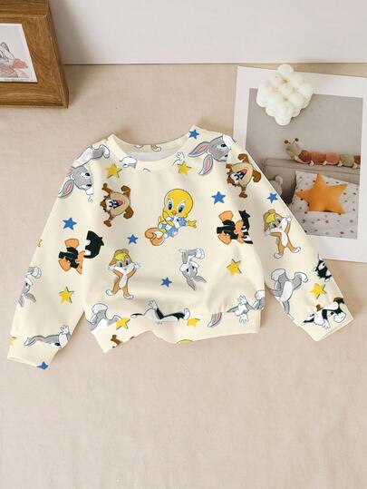 LOONEY TUNES X SHEIN 女婴休闲可爱卡通图案圆领运动衫,秋季 - 白色 - 查看 1