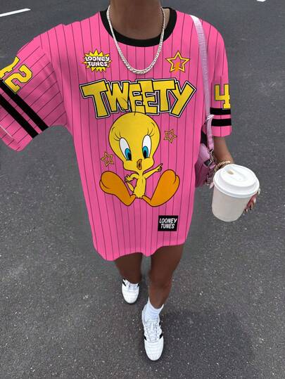 LOONEY TUNES X SHEIN 女士条纹卡通图案圆领短袖T恤 - 白色 - 查看 1