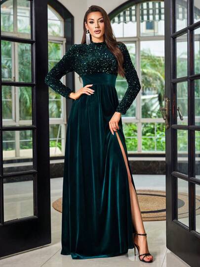 LOVE&LEMONADE 圆领长袖酒红色连衣裙,优雅正式晚会舞会婚礼宾客礼服,适合毕业典礼、晚宴 - 綠色 - 查看 1