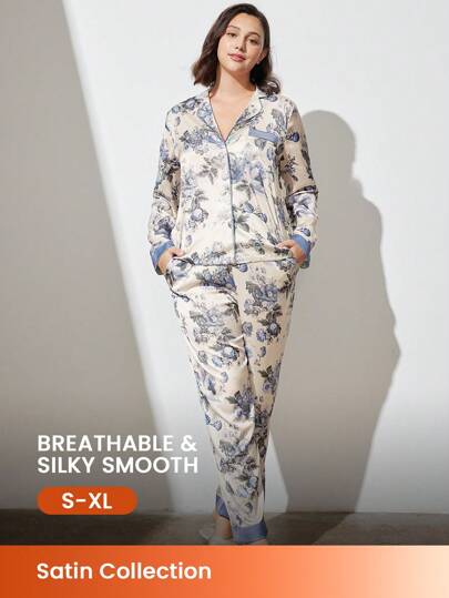 LUVLETTE 秋冬季碎花缎面长款女士睡衣套装休闲套装内衣秋季睡衣衣服 - 藍白色 - 查看 1