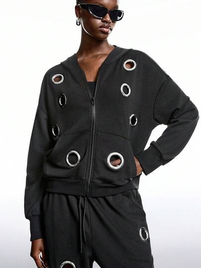 LYSMO 2025新款极简主义冬季女式时尚镂空卫衣,秋季复古风,男女皆宜的前卫时尚铆钉设计黑色连帽卫衣,短款外套,适合外出穿搭、返校季、毕业季、街头风、朋克风、Y2K风和斯德哥尔摩风,以及个性女装和独特服饰。 - 黑色 - 查看 10