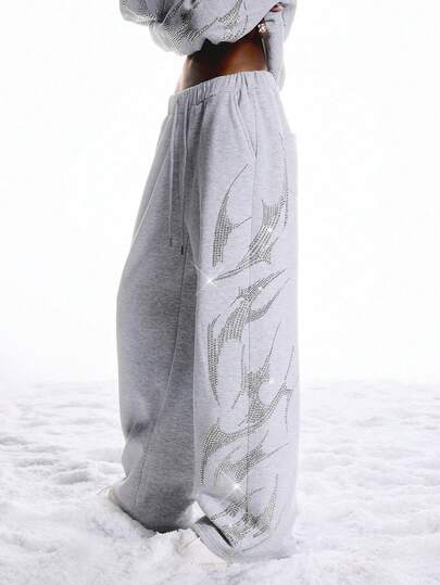 LYSMO 2025新款女士极简主义冬季休闲日常灰色水钻抽绳腰阔腿保暖闪亮运动裤,适合外出、街头风冬季穿搭、秋冬圣诞派对新年造型,亮片闪耀长裤 - 淺灰色 - 查看 2