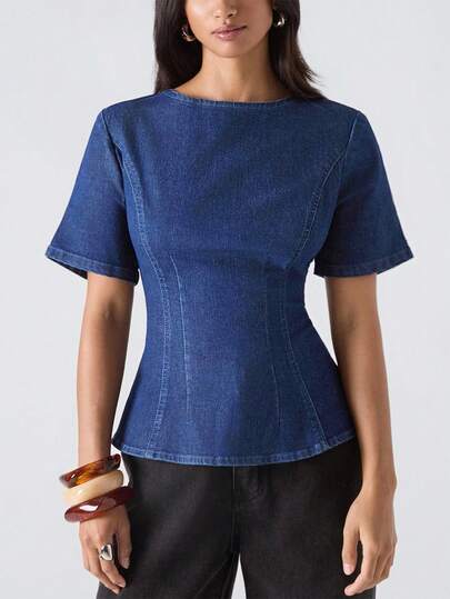 LYSMO 女式休闲时尚街头拉链短袖修身牛仔夹克 - 中等水洗藍 - 查看 1
