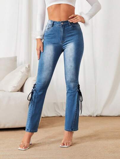 SHEIN Privé 側邊綁帶牛仔喇叭褲 - 中等水洗藍 - 查看 1