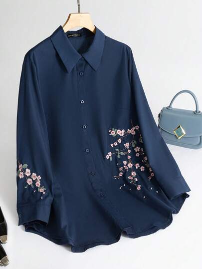 Modelyn 女士休闲花卉刺绣长袖衬衫 - 藏蓝色 - 查看 1