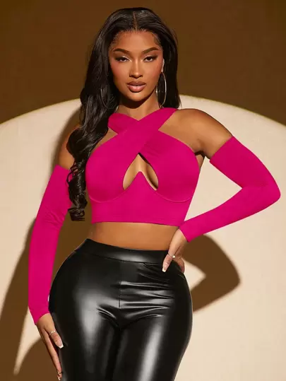 SHEIN SXY 女款純色鏤空十字交叉掛脖短t卹 - 玫紅色 - 查看 1