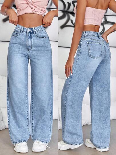 SHEIN Tall 女式宽松休闲口袋洗水直筒牛仔裤 - 中等水洗藍 - 查看 1