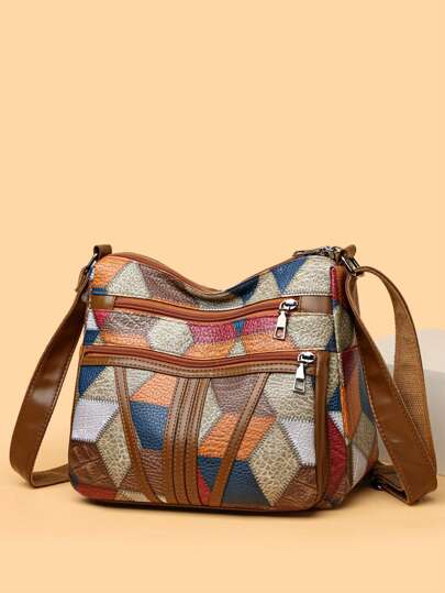 女士 PU 色格子复古大容量多口袋通勤全可调节肩带邮差包 - 棕色 - 查看 1