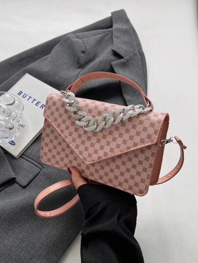 女士簡約時尚純色馬鞍包,配有縫合和鏈條裝飾 - 彩色 - 查看 1