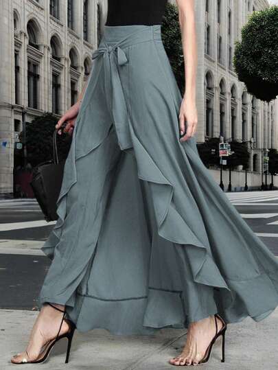 女士春夏休闲腰带开叉荷叶边短裙长裙裤子。 - 灰色 - 查看 2