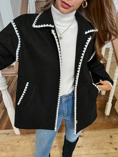 LanaWest 女士西部波西米亚风黑色龙凤图案布料领肩部刺绣花卉饰边长袖外套 - 黑色 - 查看 2