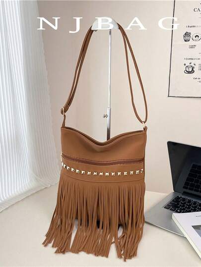 大容量流苏铆钉装饰信封包,时尚美式斜挎包,百搭ins单肩包 - 棕色 - 查看 1