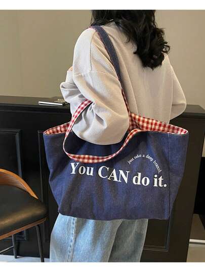 大容量格子字母双面购物袋通勤帆布单肩包2025新款条纹时尚休闲百搭单肩包 - 彩色 - 查看 1