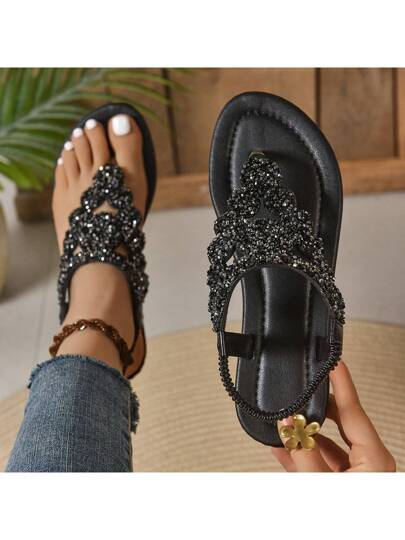 最新罗马风格波西米亚平底人字凉鞋,女士棕色 - 黑色 - 查看 1