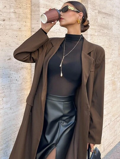 Lavishia 棕色抗皱面料长袖加长女士西装外套,秋冬通勤时尚 - 棕色 - 查看 6