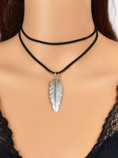 葉子墜飾多層次項鍊 - 黑色 - 查看 1