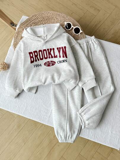 Leap Crew 2件套男童可爱灰色字母印花长袖卫衣和裤子套装,秋冬季