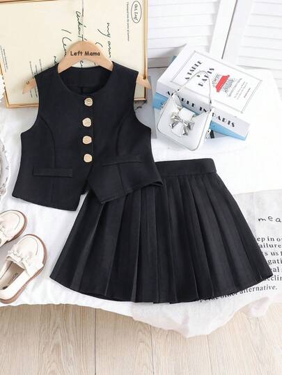 Left Mama 少女时尚黑色背心上衣配金色纽扣和百褶裙套装,夏季上学/工作装 - 黑色 - 查看 1