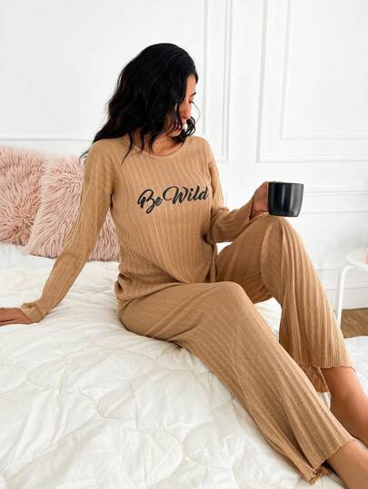 RueChic 字母图案落肩休闲套装 - 棕色 - 查看 1